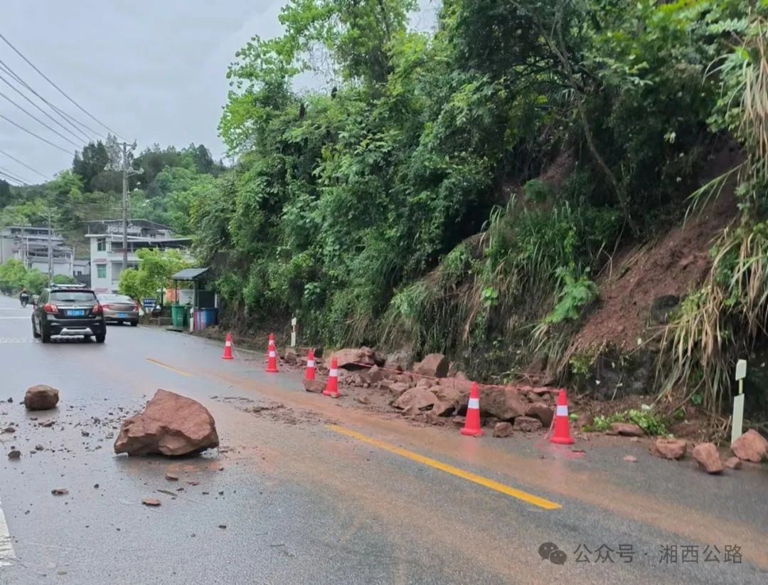 ▲由于坡面时有垮塌,现场暂不具备抢险条件,永顺县公路部门与当地党委政府、公安交警等部门共同商议灾情观测、交通管制、道路绕行方案。