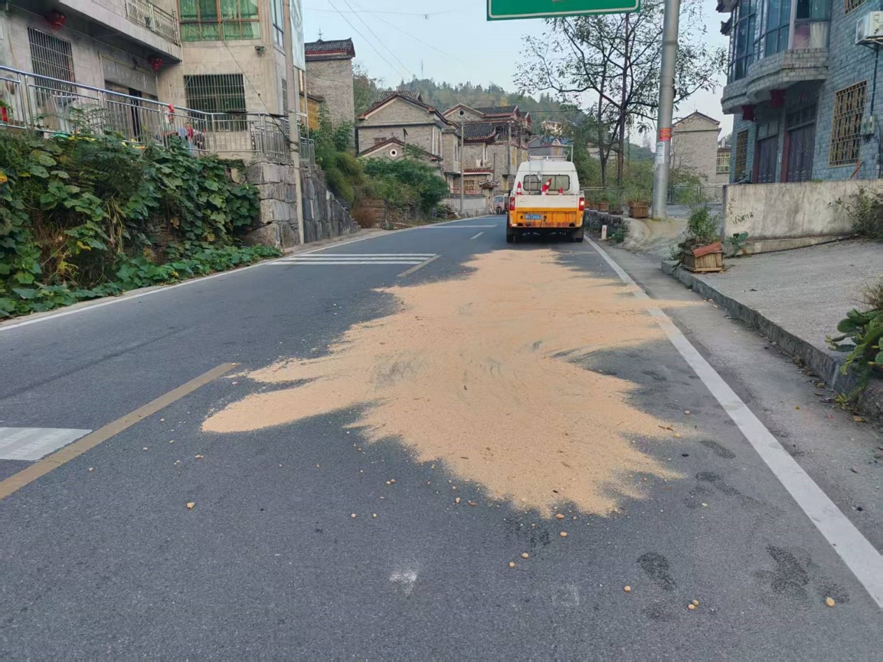 当天16时50分许,该中心接到交警部门通报:国道G209线阳孟段发生交通事故,事故车辆油料泄漏并污染路面,若不及时处置,可能引发二次事故。接报后,中心应急处置队伍迅速携带锯木屑、警示灯、安全锥等装备物资赶赴现场。到达现场后,应急队员结合路面污染范围与程度,立即采取“锯木屑覆盖吸附”的专业处置方式,对泄漏油料进行处理。经过1小时的持续作业,至18时许,泄漏的油料被完全清理,路面恢复正常通行条件,有效保障了过往车辆的行驶安全。