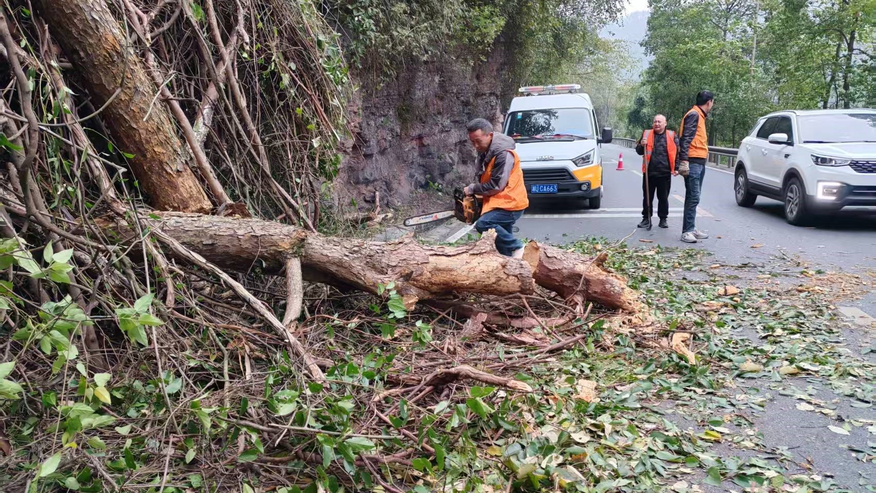 11月17日,受强冷空气南下引发的大风影响,G319线吉首市河溪镇阿娜段一棵树木被吹倒并横亘路面,严重阻碍国道通行。吉首市公路建设养护中心快速响应、高效处置,仅用1小时便完成树木清理,恢复道路畅通。