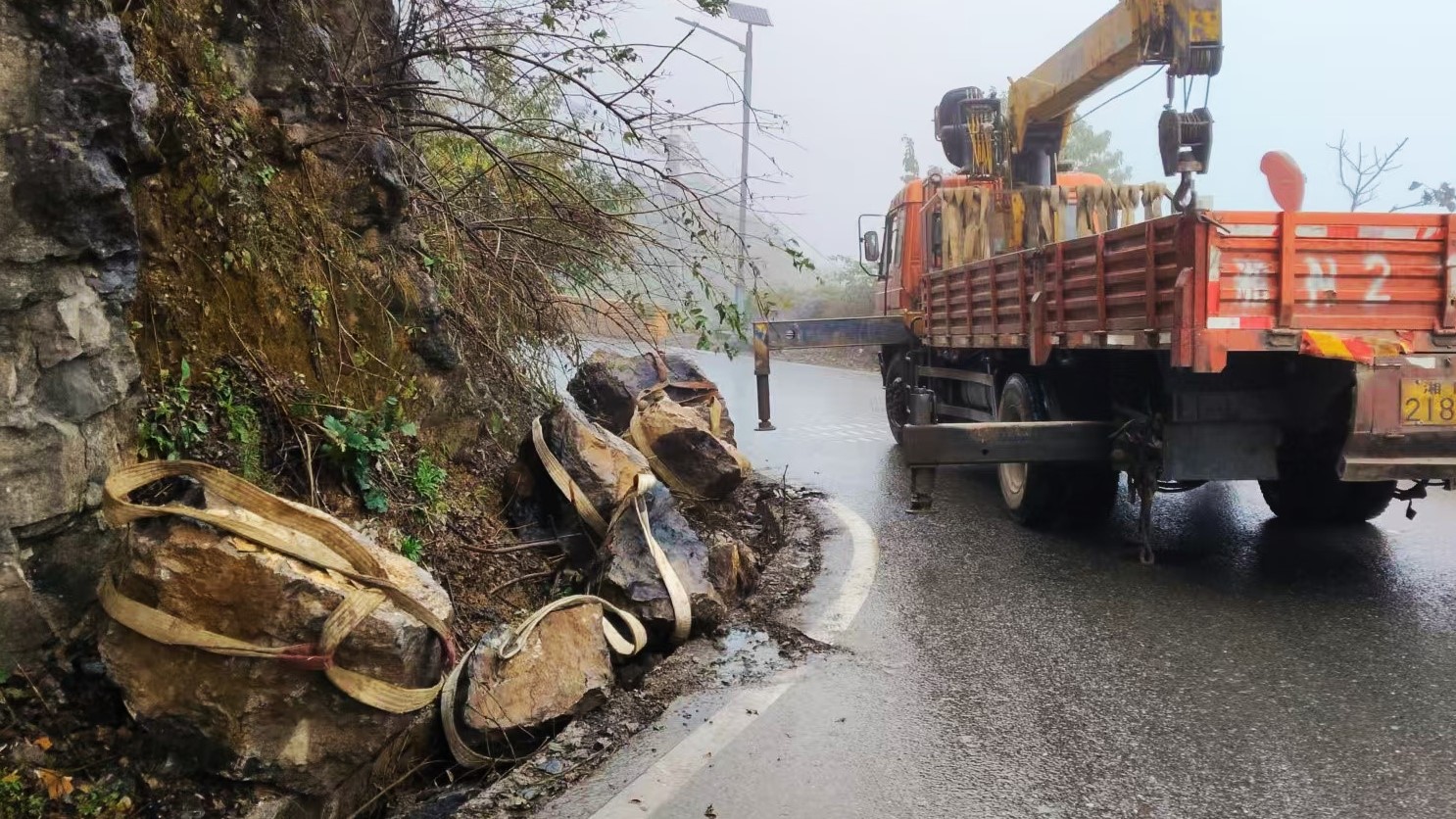 11月20日上午,龙山县X008线路段突发山体落石险情,对过往车辆及群众的出行安全构成严重威胁。龙山县公路建设养护中心发现险情后迅速响应,高效完成清障作业,确保道路及时恢复畅通。