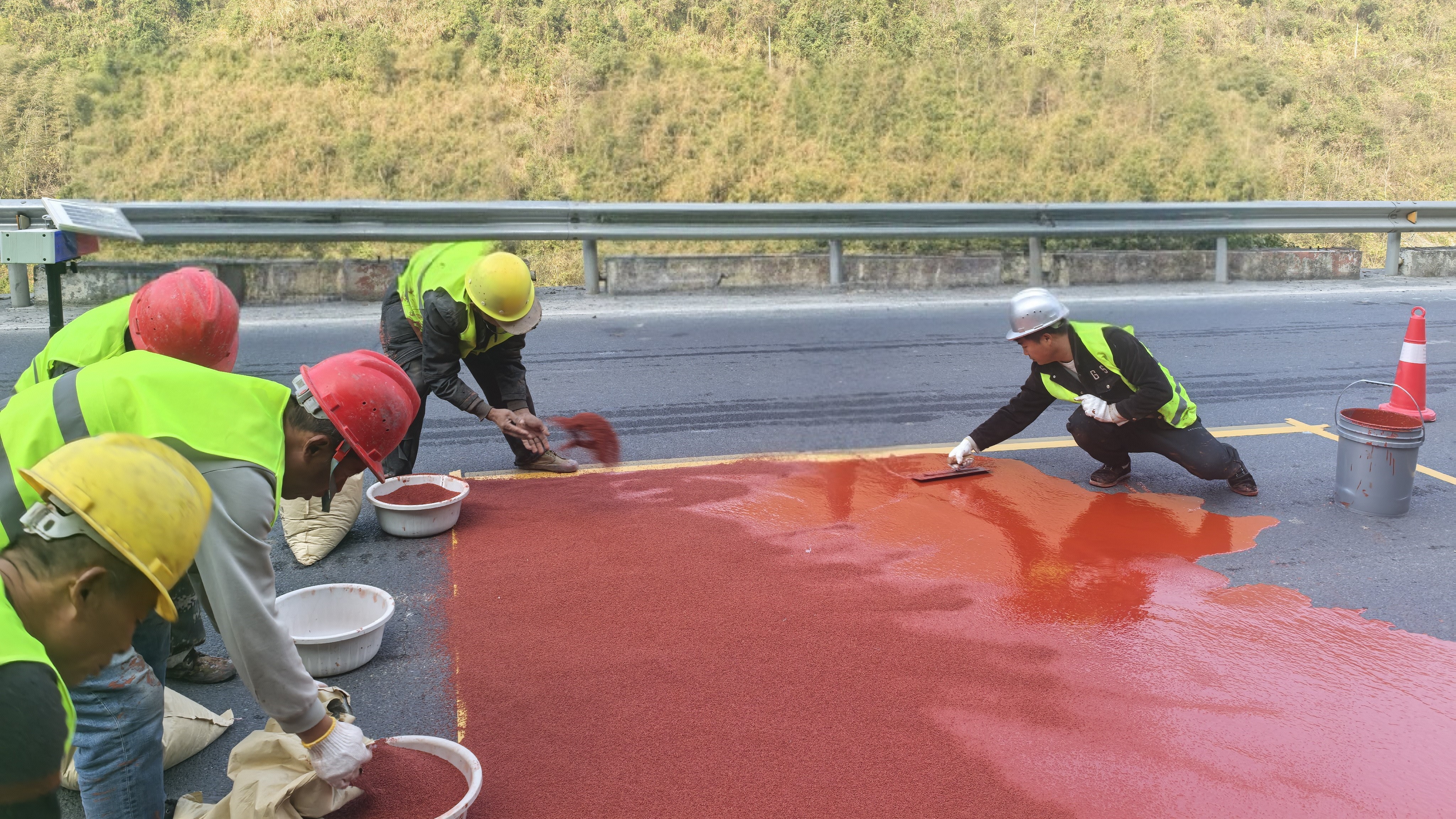 据现场负责人介绍,该路段是当地老司机熟知的长下坡路段,坡度陡、里程长,雨天或低温天气极易出现路面打滑现象,车辆通行安全隐患不小,长期以来都是公路养护的重点防范路段。此次隐患治理的主要措施是,通过每间隔20米增设14-28平方米不等的路面防滑层,在该路段铺设总面积达2000余平方米的红色陶瓷颗粒防滑层。铺装完成后,红色防滑层与普通灰色路面形成的强烈视觉差异可提醒驾驶员提早观察路况、主动降低车速;同时,陶瓷颗粒的高硬度与耐磨性可显著提升路面摩擦系数,雨天刹车距离可缩短40%以上,卓越的防滑性能从根本上降低了车辆打滑风险,让行车更稳当。