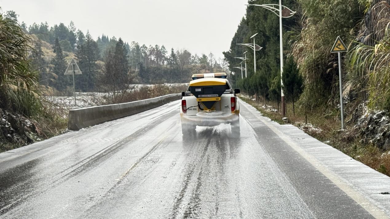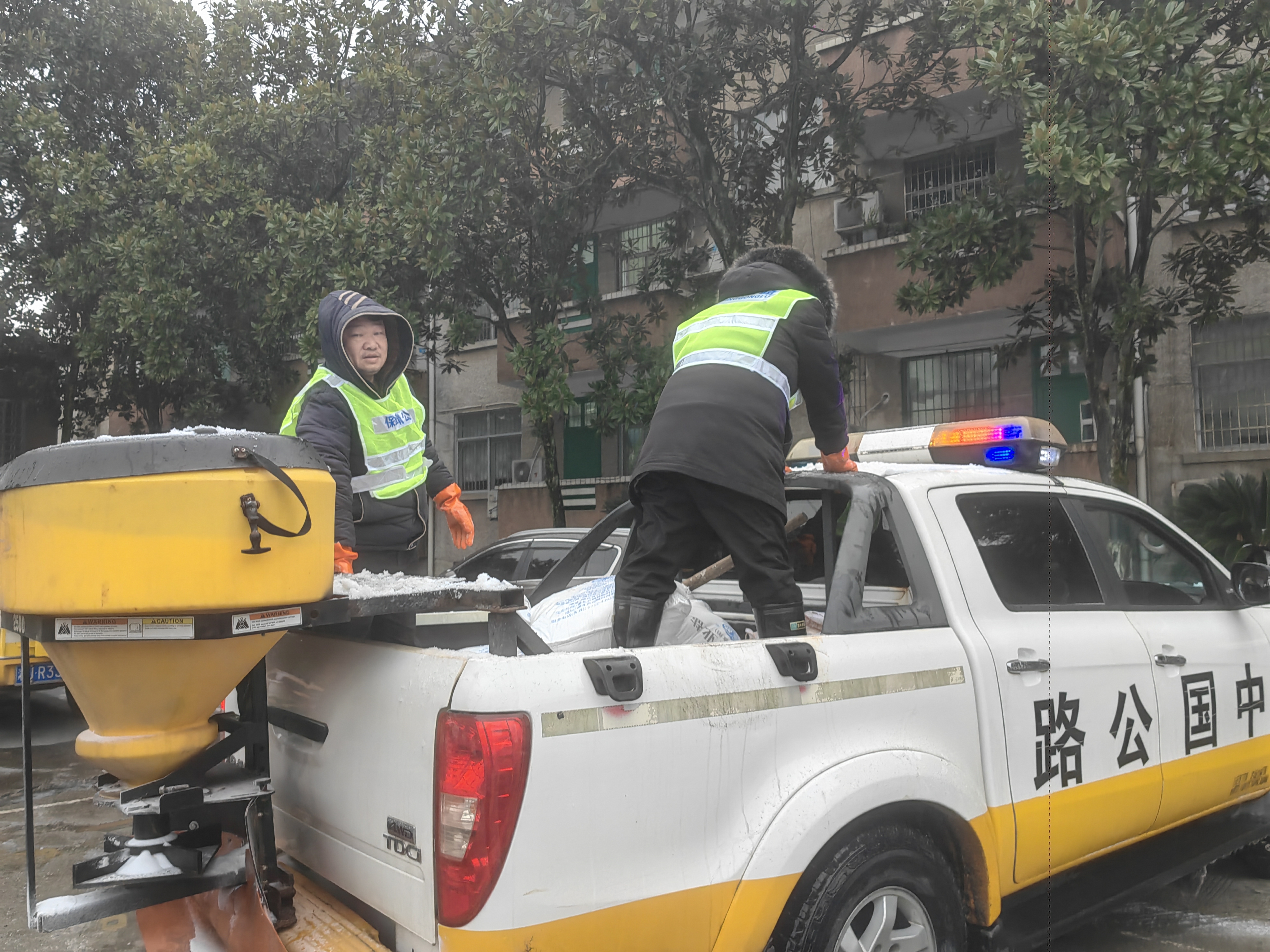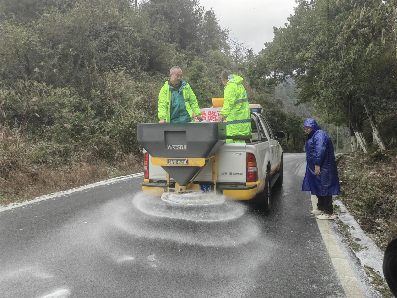 此次抢险行动中,养护中心科学调配力量,派遣12名应急抢险人员组成3支应急抢险小组,配备3台应急抢险车辆,重点对S253线、S318线等国省干线公路的高风险路段、关键节点进行全方位巡查与处置。抢险人员根据路面积雪结冰情况,精准开展撒盐作业,累计使用融雪剂3吨,有效加速冰雪融化,降低路面结冰风险。