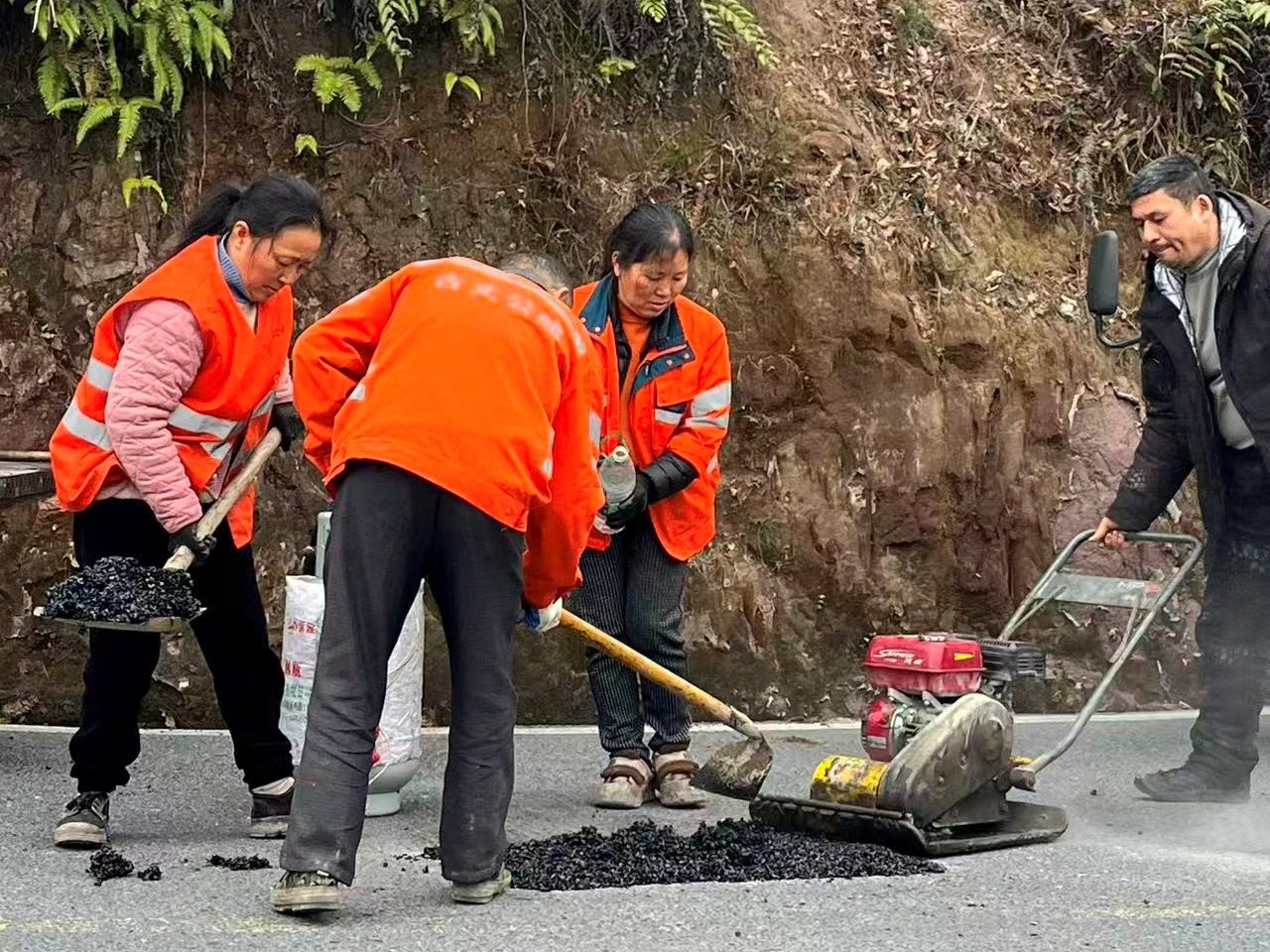 在作业现场,身着橘红色反光背心的养护职工分工协作、高效推进。按照“破拆—清理—打底—摊铺—压实”的标准化流程,他们先用电锤破碎坑槽内破损路面,再以铁锹、扫帚彻底清理碎石杂物,涂刷炼化石油增强黏结力,随后将沥青冷补料摊铺至坑槽并加热,最后用小型平板夯反复压实成型。整套工序衔接紧密,原本坑洼不平的路面快速恢复平整,为过往车辆扫清通行障碍。