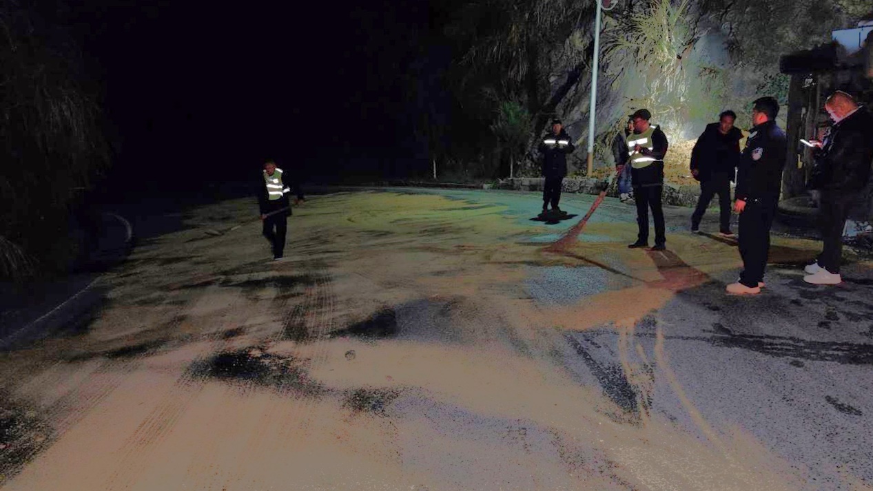2月3日22时许,保靖县公路建设养护中心接到群众反馈,S318线思源学校后方弯道处发生大货车侧翻事故,车辆油箱破损导致大量燃油泄漏,污染路面后给夜间行车带来严重安全隐患。