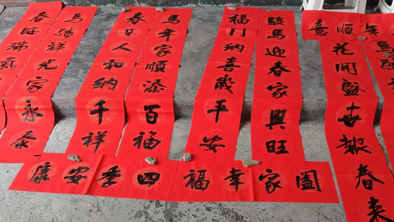 活动现场,红通通的春联纸在乒乓球桌上铺展,宛如一簇簇跳动的火苗。两位书法家凝神聚力,手腕轻转,狼毫笔饱蘸浓墨后在红纸上挥洒自如,刚劲有力的楷书、飘逸洒脱的行书跃然纸上。“马踏祥光家永泰,春临瑞气户常安”“驻马迎春家兴旺,顺时纳福岁平安”等一幅幅寓意吉祥的春联,将美好祝愿融入笔墨之中。
