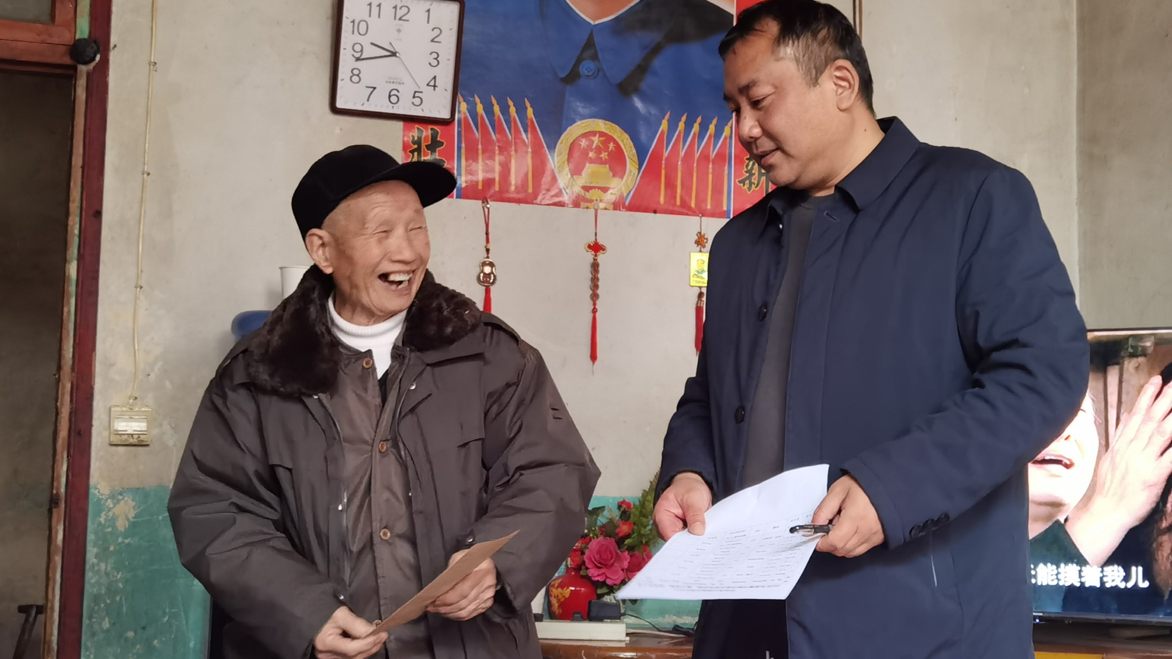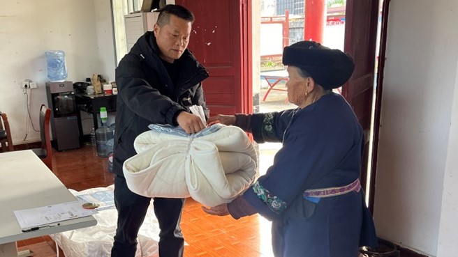 在双龙镇卧龙坪村、让乍村、董马库村,慰问组重点走访慰问了55户散养五保户、监测户等特殊困难群众,与乡亲们促膝长谈,细致询问家庭生活状况、实际困难以及春节安排,为困难群众送上慰问金和30余床御寒棉被,反复叮嘱大家注意防寒保暖、保重身体,并送上新春祝福。