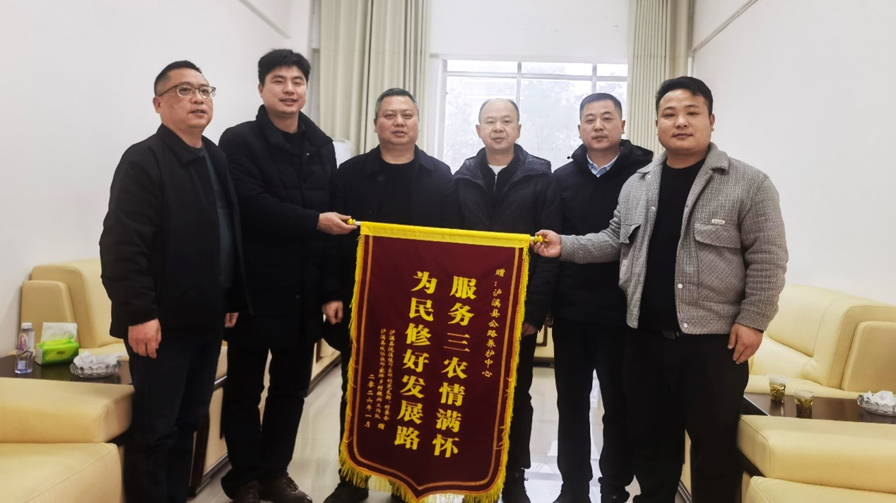 2月11日下午,泸溪县洗溪镇邓家坪村党支部、村委会携手县政协驻邓家坪乡村振兴工作队,将一面印着“服务三农情满怀为民修好发展路”的锦旗送到泸溪县公路建设养护中心,以此感谢该中心修缮Y089线邓家坪路段,切实解决群众出行难题、助力乡村发展的暖心举措。
