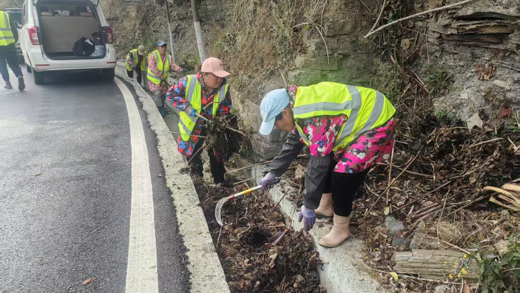 矮寨盘山公路是吉首标志性通景要道,连接矮寨奇观旅游区,全长约6公里,沿线涉及多个村落,旅游客运车辆占比高。该路段边坡陡、弯道多,对排水条件要求高,且旅游通行需求大。针对这些特点,该中心组织20余人的专业养护队伍,对沿线排水系统开展集中疏通,重点清理排水沟内的淤泥、杂草、落石及杂物。截至目前,已累计清理排水沟2.4公里,清运淤泥、垃圾约2车,保障排水管网畅通,消除路面积水、边坡溜塌等安全隐患,为群众和游客春运出行保驾护航。