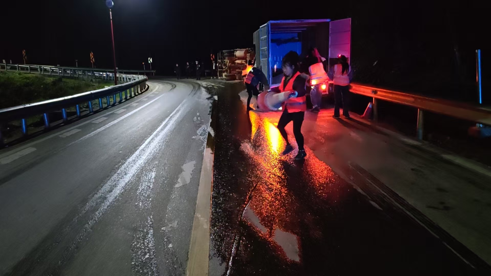 3月4日19时50分,花垣县公路建设养护中心干养股值班人员接报,G209线K2657+780花垣县梨子园路段发生一起货运车辆侧翻事故,事故导致大量油污泄漏,对道路通行安全造成严重影响。该路段地处坡道与弯道结合处,视线较差、路况复杂,油污附着路面易引发车辆打滑,若不及时处置,极易诱发二次交通事故。