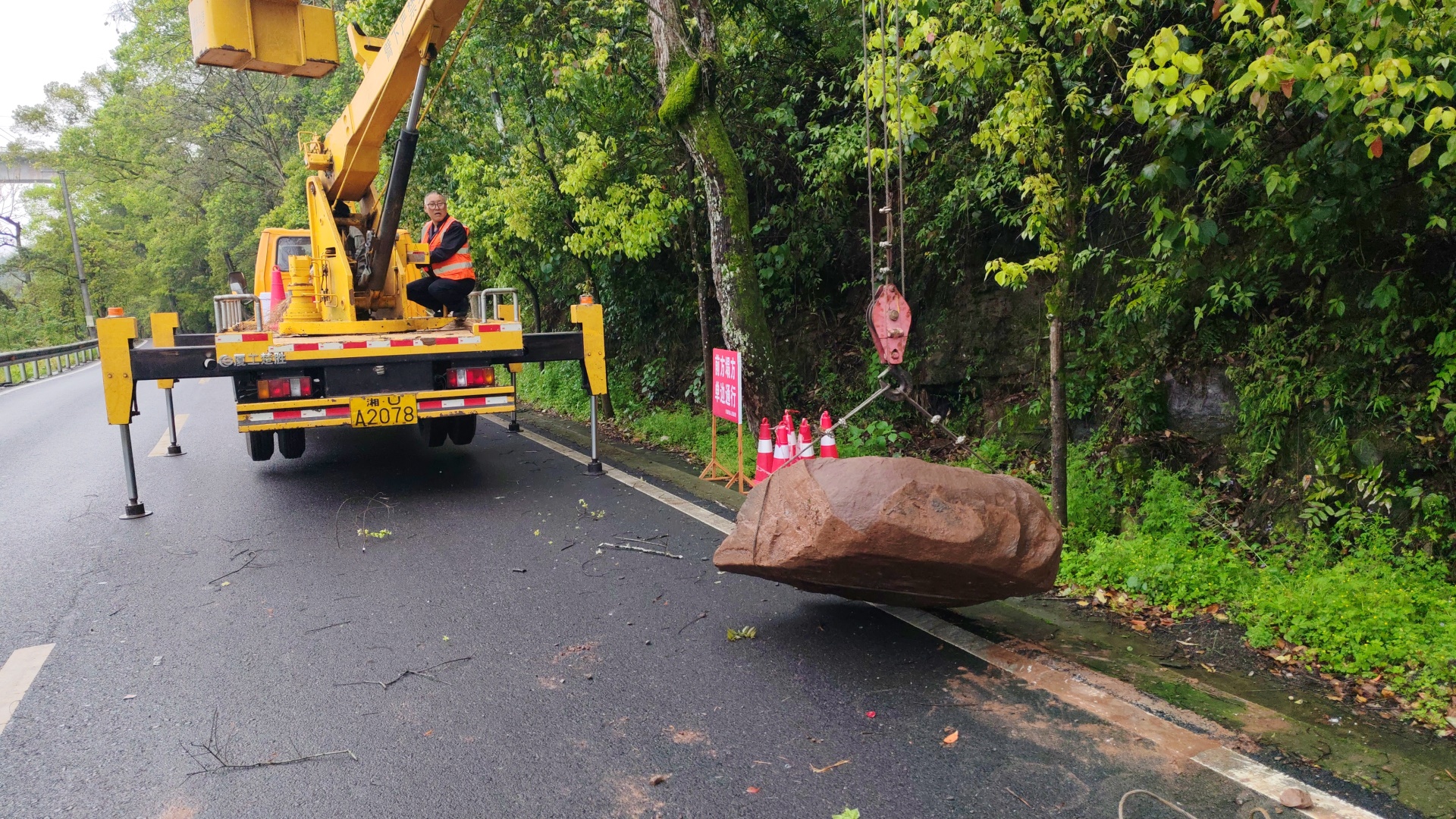 4月11日凌晨,受持续强降雨影响,G319线阿娜路段突发大块山石滚落路面险情,侵占行车道,存在重大安全隐患。养护人员第一时间抵达现场设置警示标识,引导车辆减速避让。当日7时20分雨势减弱后,8名抢险人员、1台登高车迅速开展清理作业,仅用32分钟便彻底清除落石、排查边坡隐患,道路恢复正常通行。